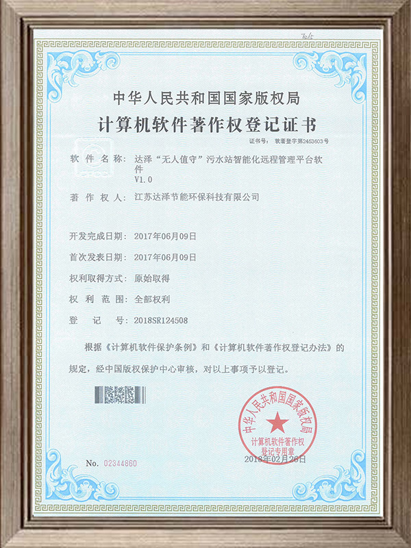 达泽“无人值守”污水站智能化远程管理平台软件软著证书