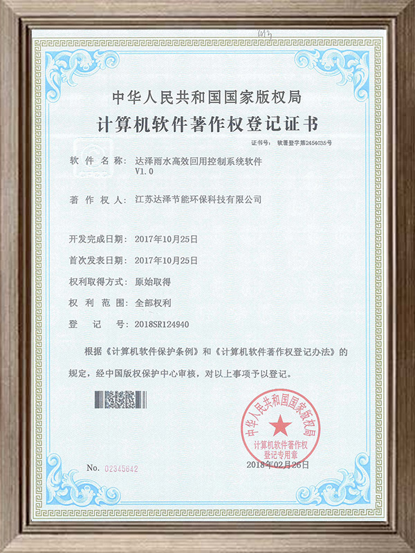达泽雨水高效回用控制系统软件软著证书